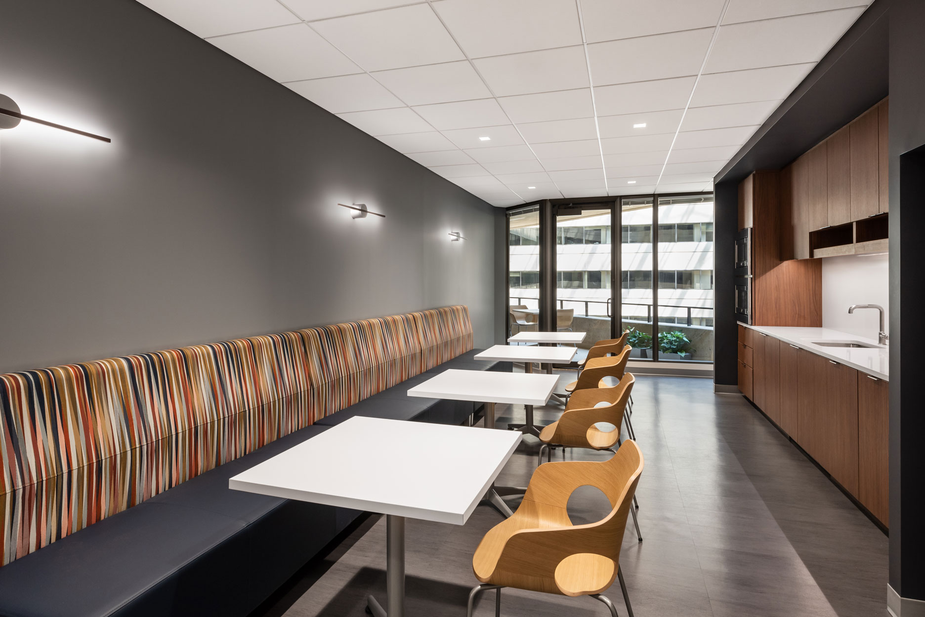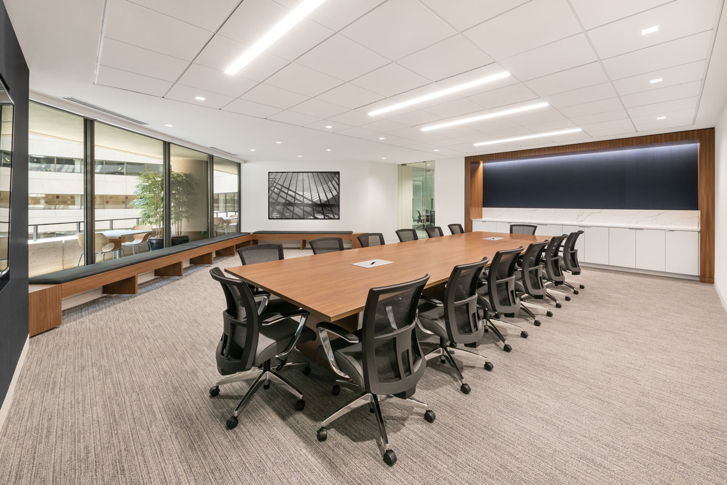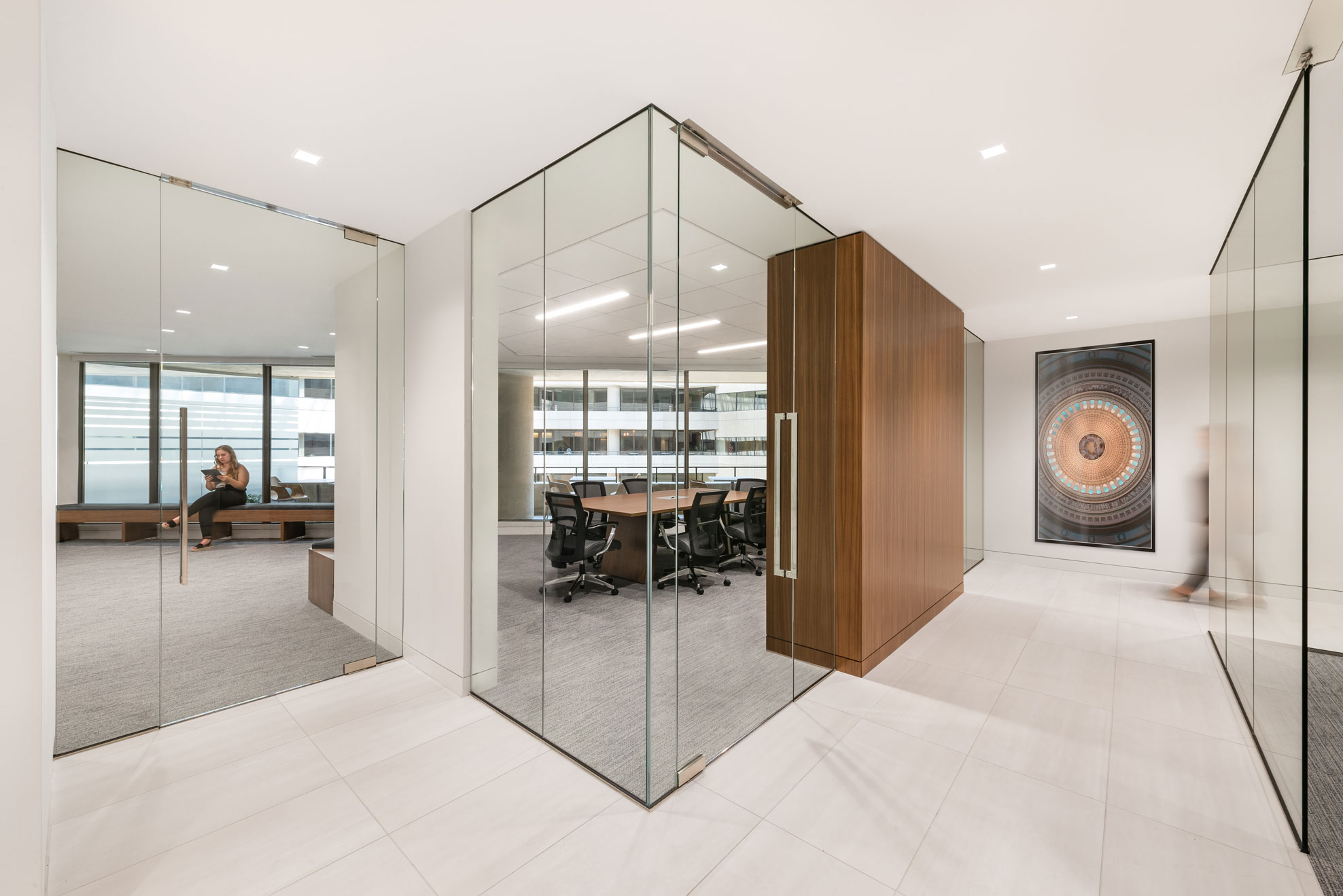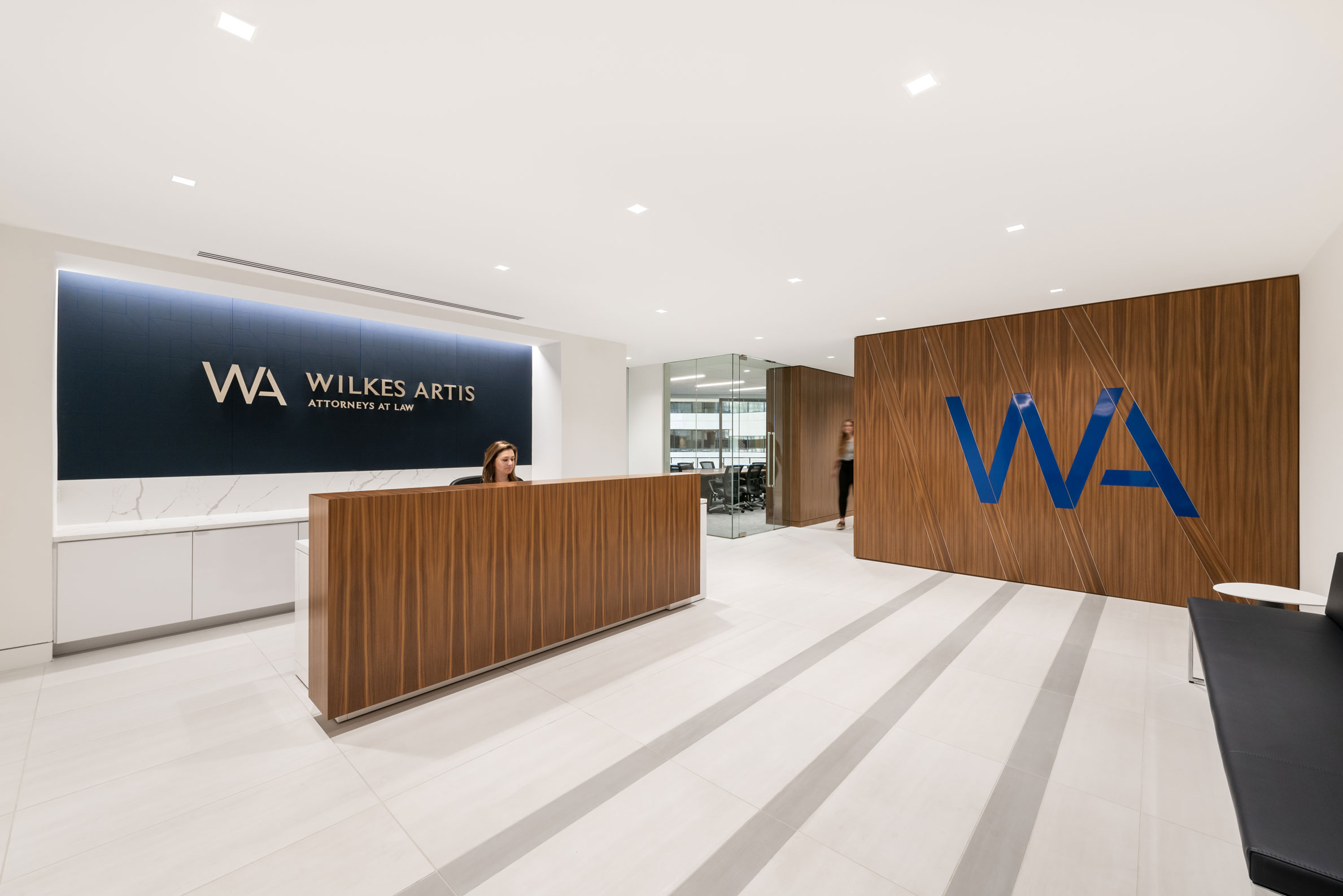 Wilkes Artis wished to create an efficient and functional forwarding thinking office while respecting their history as one of the oldest law firms in the nation’s capital. The firm’s branding is integrated into custom walnut veneer panels creating the focal point for the reception area. Attention to detail and careful material selection is paramount to achieving a successful first impression.