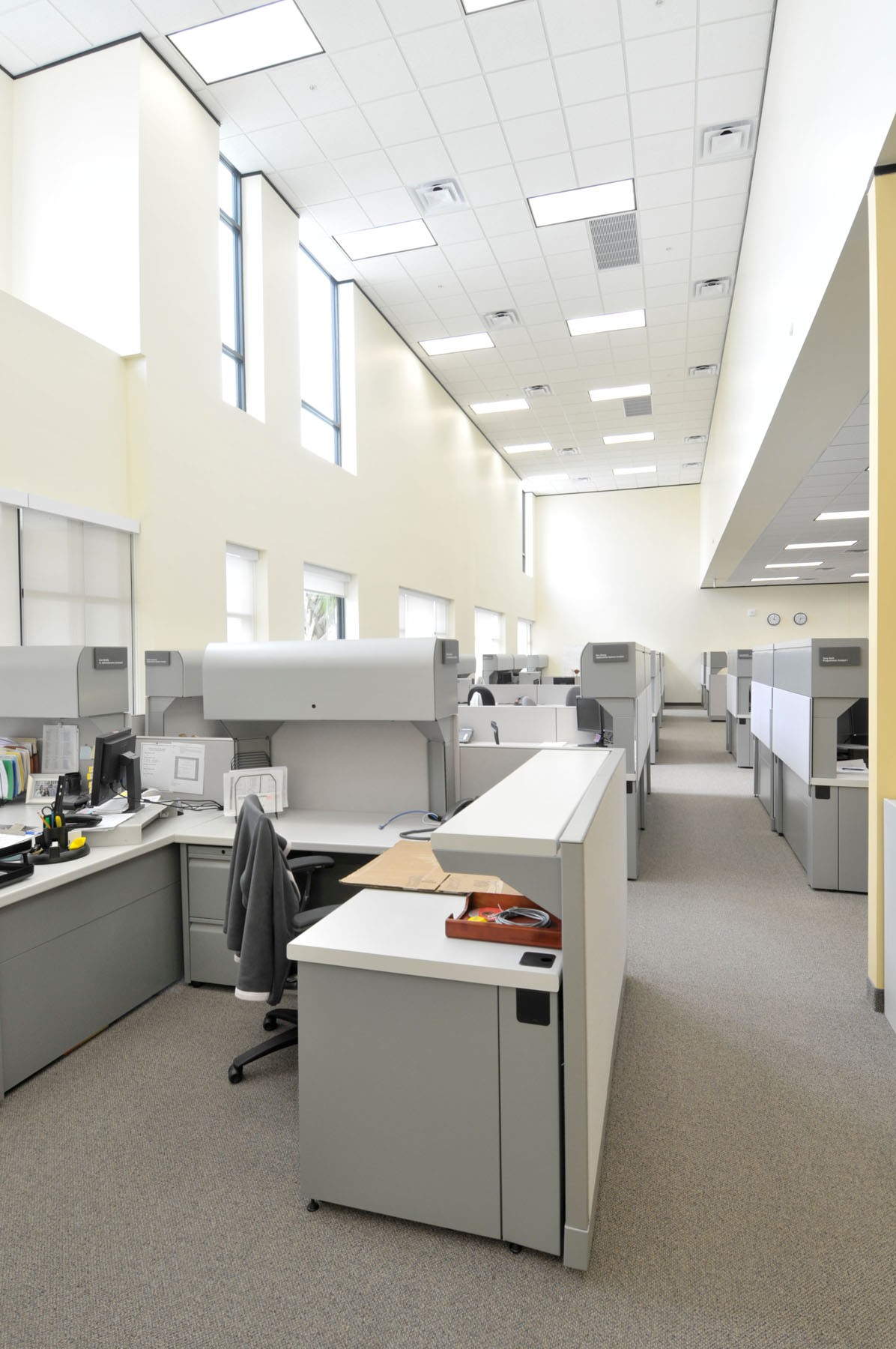 The interior spaces in both buildings have been designed to accommodate numerous tenants within the MD Anderson umbrella. Each tenant has a unique requirement ranging from security of documentation (compliance with HIPAA requirements), to 24 hr work environments and file storage. It was a design requirement that employees occupying the spaces have a sense of equality. Constants between both spaces include double height ceilings along the perimeter walls allowing the clerestory glazing to penetrate deep into the building to maximize natural light. Open office areas are characterized by 11’-0” high ceilings and openings to the exterior glazing.